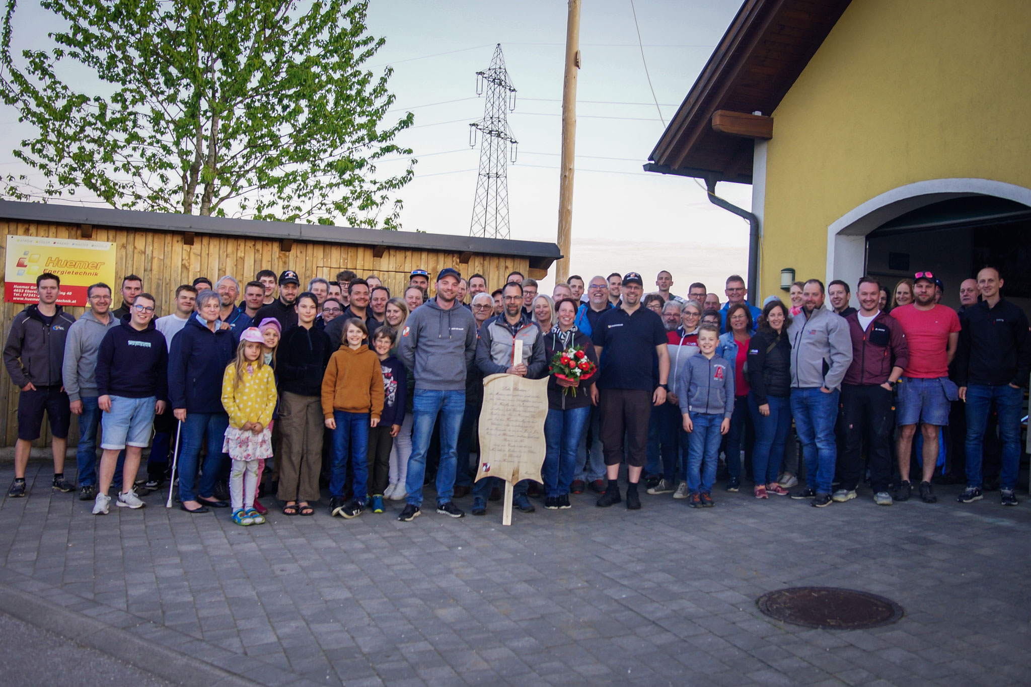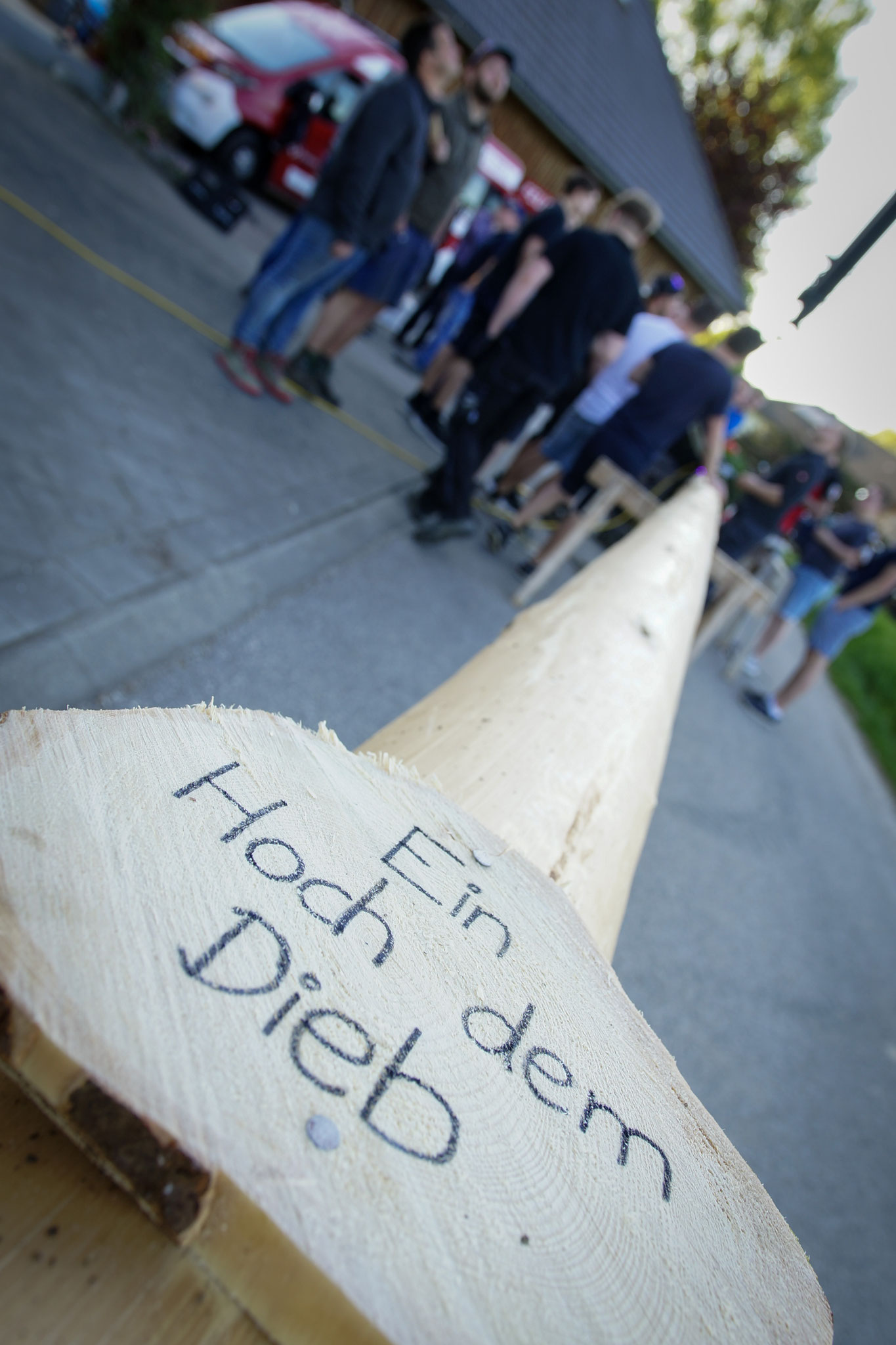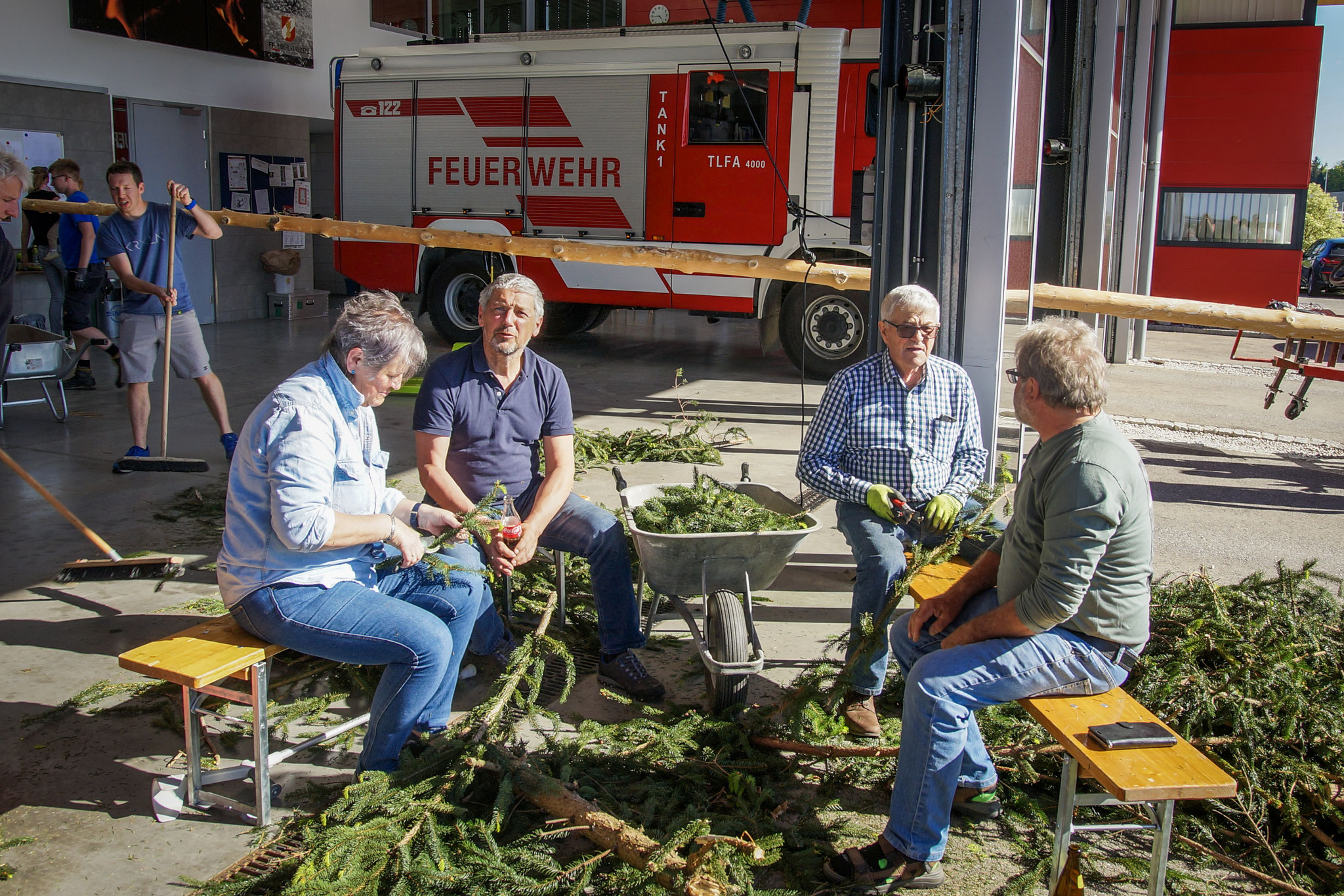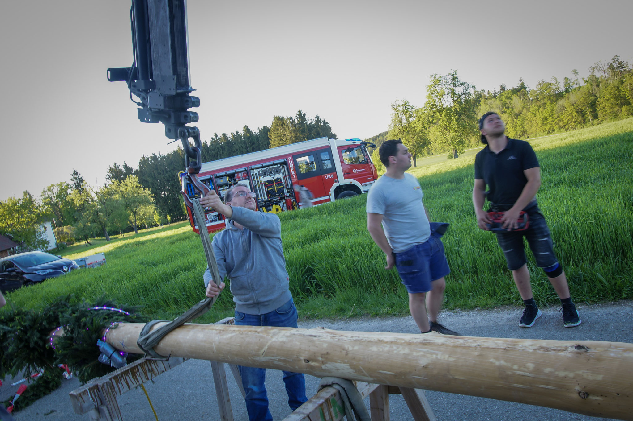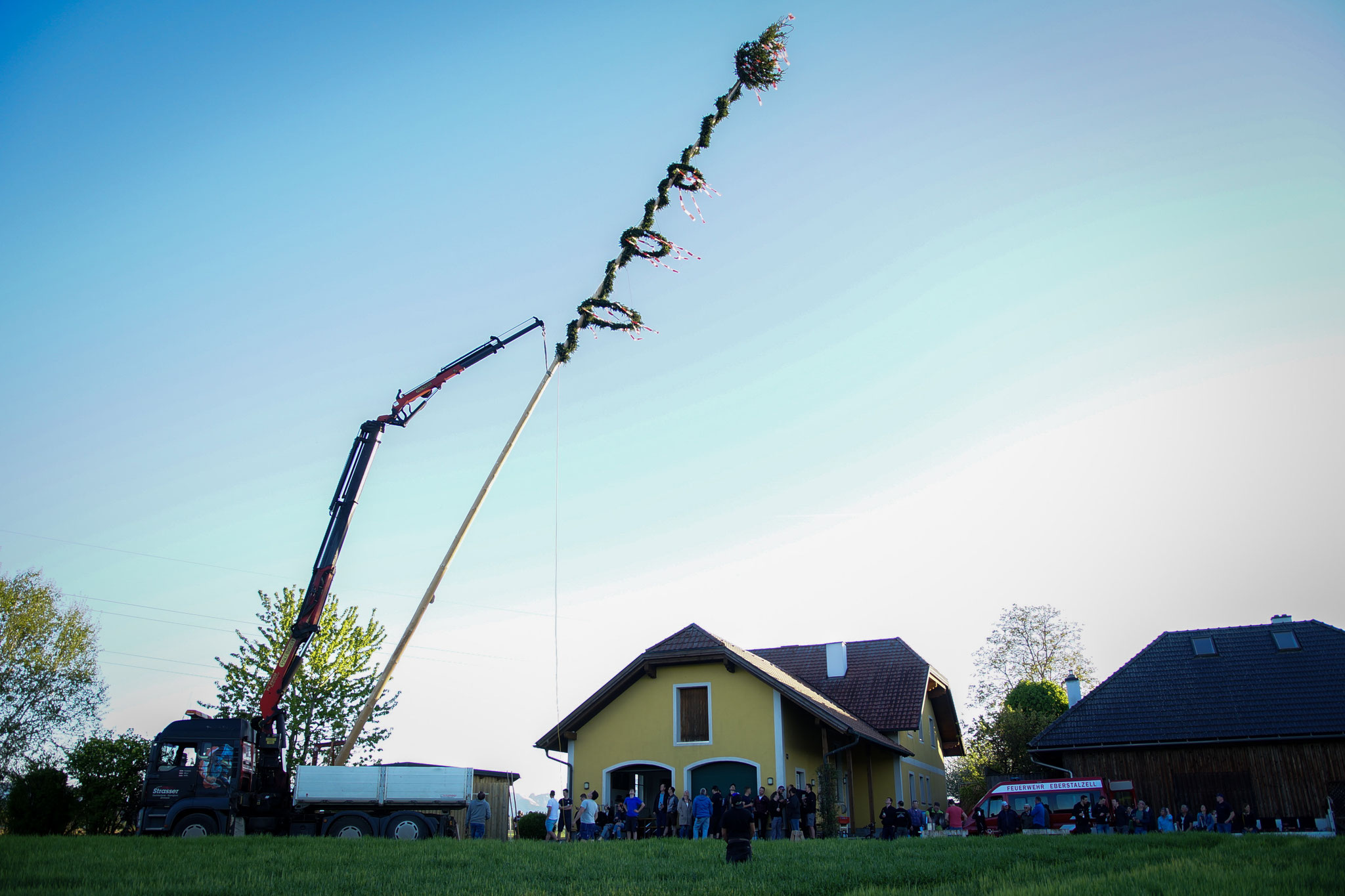 Im Feuerwehrhaus haben wir den Maibaum liebevoll vorbereitet und die Kränze gebunden, bevor wir ihn dann in einem festlichen Konvoi durch die Straßen von Eberstalzell begleitet haben. Und nun
